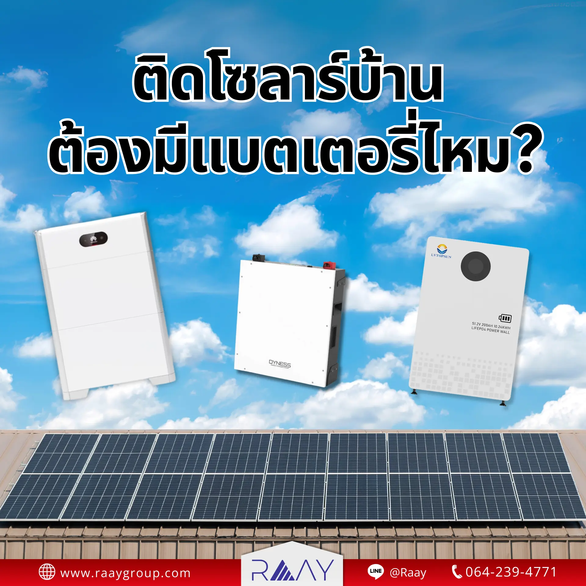 การติดโซลาร์บ้าน ไม่จำเป็นต้องมีแบตเตอรี่เสมอไป หากคุณต้องการเพียงลดค่าไฟฟ้า ระบบ On-Grid ก็เพียงพอ แต่ถ้าคุณกังวลเรื่องไฟดับ ต้องการใช้ไฟอย่างต่อเนื่อง หรืออยู่ในพื้นที่ที่ไฟฟ้าเข้าไม่ถึง การลงทุนติดตั้งแบตเตอรี่ก็เป็นทางเลือกที่คุ้มค่า